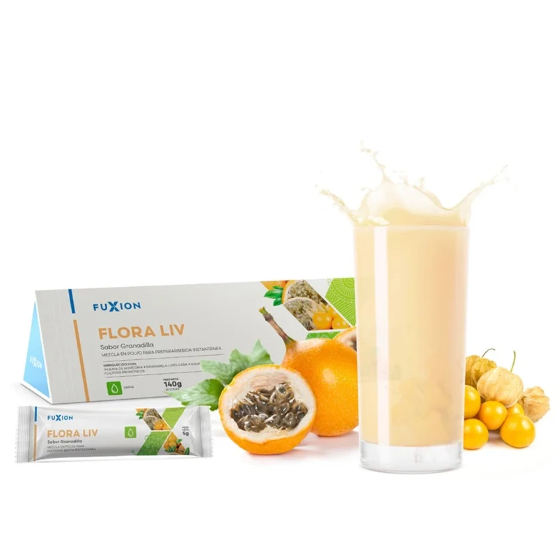 Flora Liv es una exquisita bebida probiótica sabor granadilla, creada por FuXion para ayudarte a promover una correcta asimilación de nutrientes, mejorar los procesos digestivos, reforzar el sistema inmunológico y reconstruir la flora intestinal dañada, sobre todo por el uso excesivo de medicamentos.